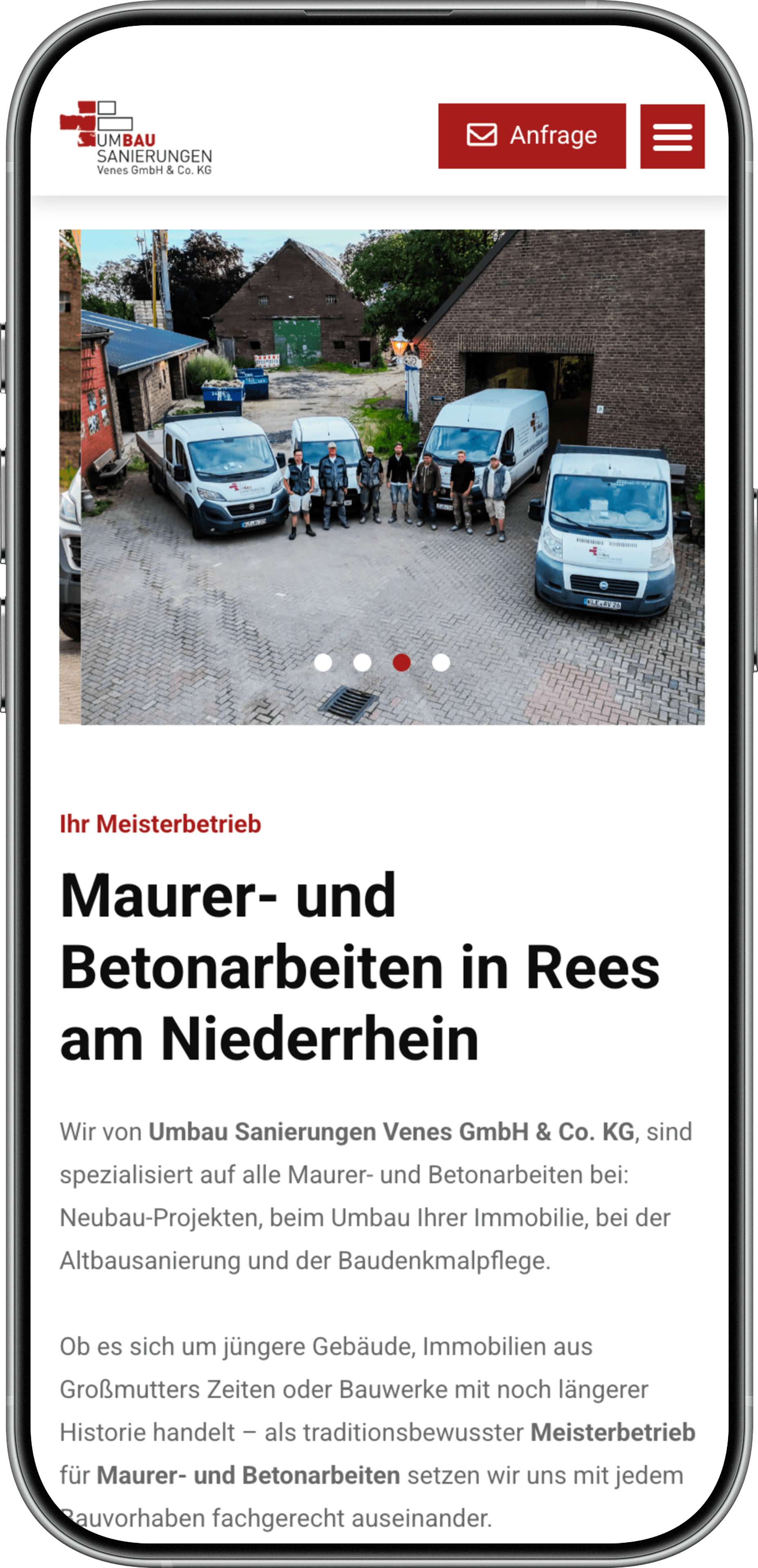 Ob Sie noch gar keine Website haben oder Ihre aktuelle längst nicht mehr zu Ihrem Betrieb passt: morgenrot bringt Ihren Auftritt auf Stand — und hält ihn aktuell. Für Unternehmen aus Rees, Bocholt, Emmerich, Kleve, Rhede, Isselburg, Hamminkeln, Wesel und dem Kreis Borken.
